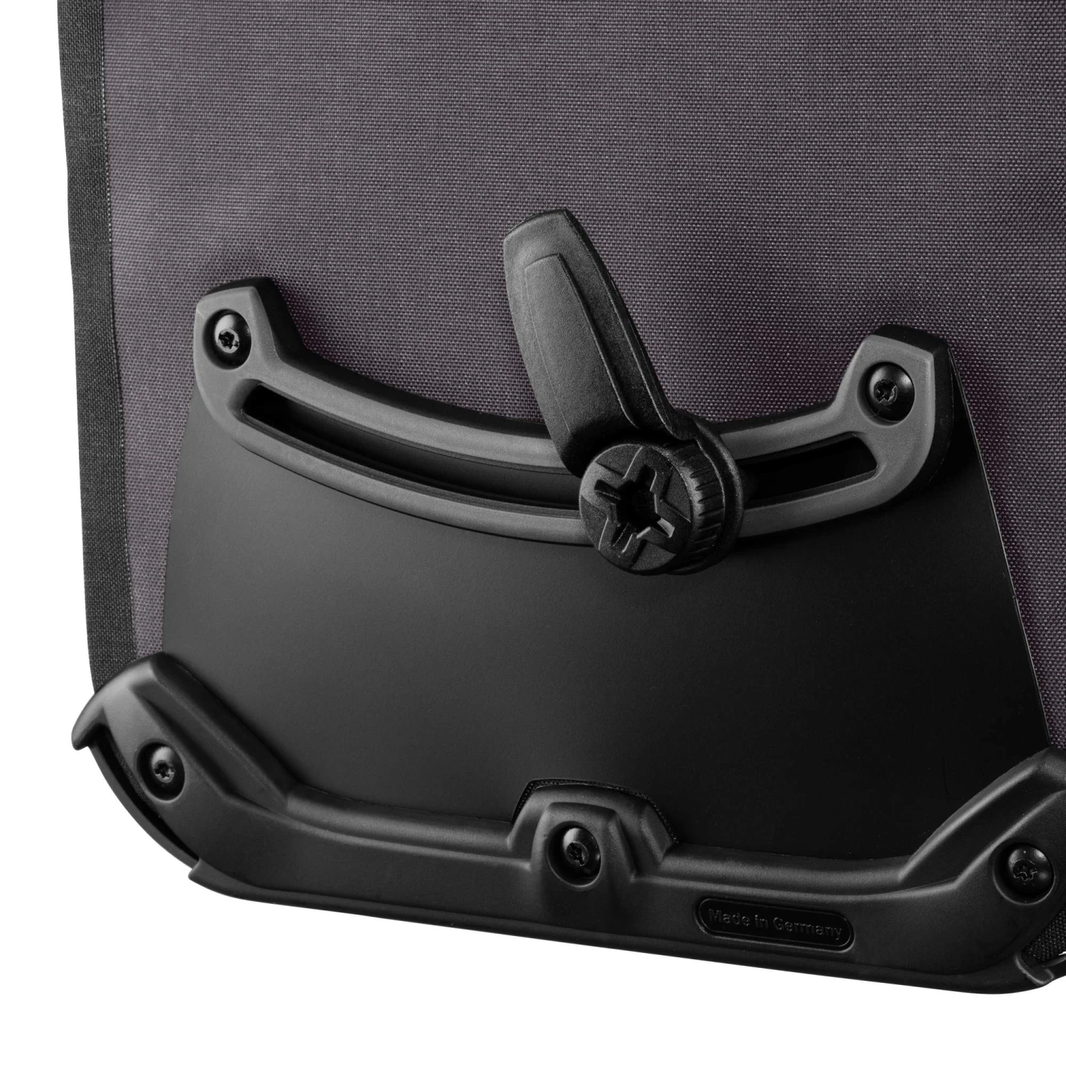 Aufhängung für Gepäckträger mit einem Rohrdurchmesser von 8 bis 16 mm. Beim QL2.1-System wurde die Schiene mit den Befestigungshaken an der Taschenrückseite überarbeitet. Die beiden oberen Haken lassen sich werkzeugfrei auf der nun aus einem Stück gefertigten Schiene verschieben und durch Anheben des Tragegriffs öffnen. Der untere Arretierungshaken ist ebenfalls auf einer halbelliptischen Schiene individuell anpassbar und werkzeugfrei in 15°-Schritten drehbar. Ein Scheuerschutz im unteren Bereich der Taschen und an der Auflagefläche des Gepäckträgers beugt Abrieb vor.